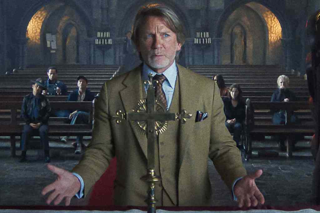 That aforementioned mainstay is Benoit Blanc (Daniel Craig), an ace detective fitted with the mannered niceties of the south and the elocution of Foghorn Leghorn, though he’ll have to work on his punctuality. He’s nowhere to be seen in the first 40 minutes of Wake Up Dead Man, waiting in the bullpen as we learn about the trials and tribulations of Jud Duplenticy (Josh O’Conner). In the aftermath of a violent but shrugged-off altercation, boxer-turned-priest is reassigned to a new parish in the film’s opening frames, taking his soft-spoken passion to Our Lady of Perpetual Fortitude in upstate New York. Despite Duplenticy’s assistant tag, the church’s residing leader, Monsignor Wicks (Josh Brolin), only sees an adversary, butting heads with his youthful charge in both dogma and primacy. A fire-and-brimstone type, Wicks’ scorched-earth sermons clash aggressively against Jud’s belief in kindness and absolution, marking the insurgent as a top suspect when the chapel becomes a crime scene. Enter Blanc, and all the zany sleuthing to which we’ve become accustomed.